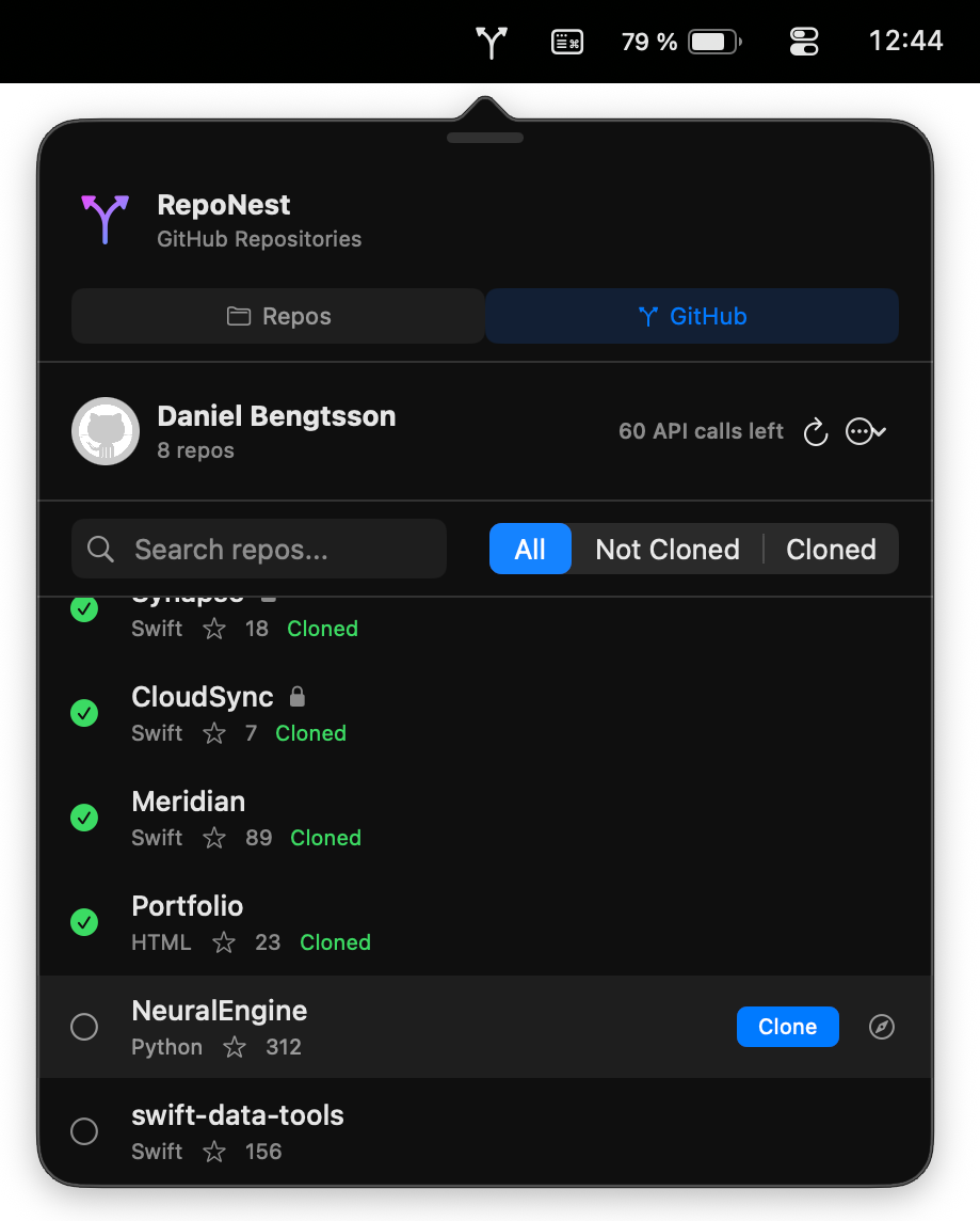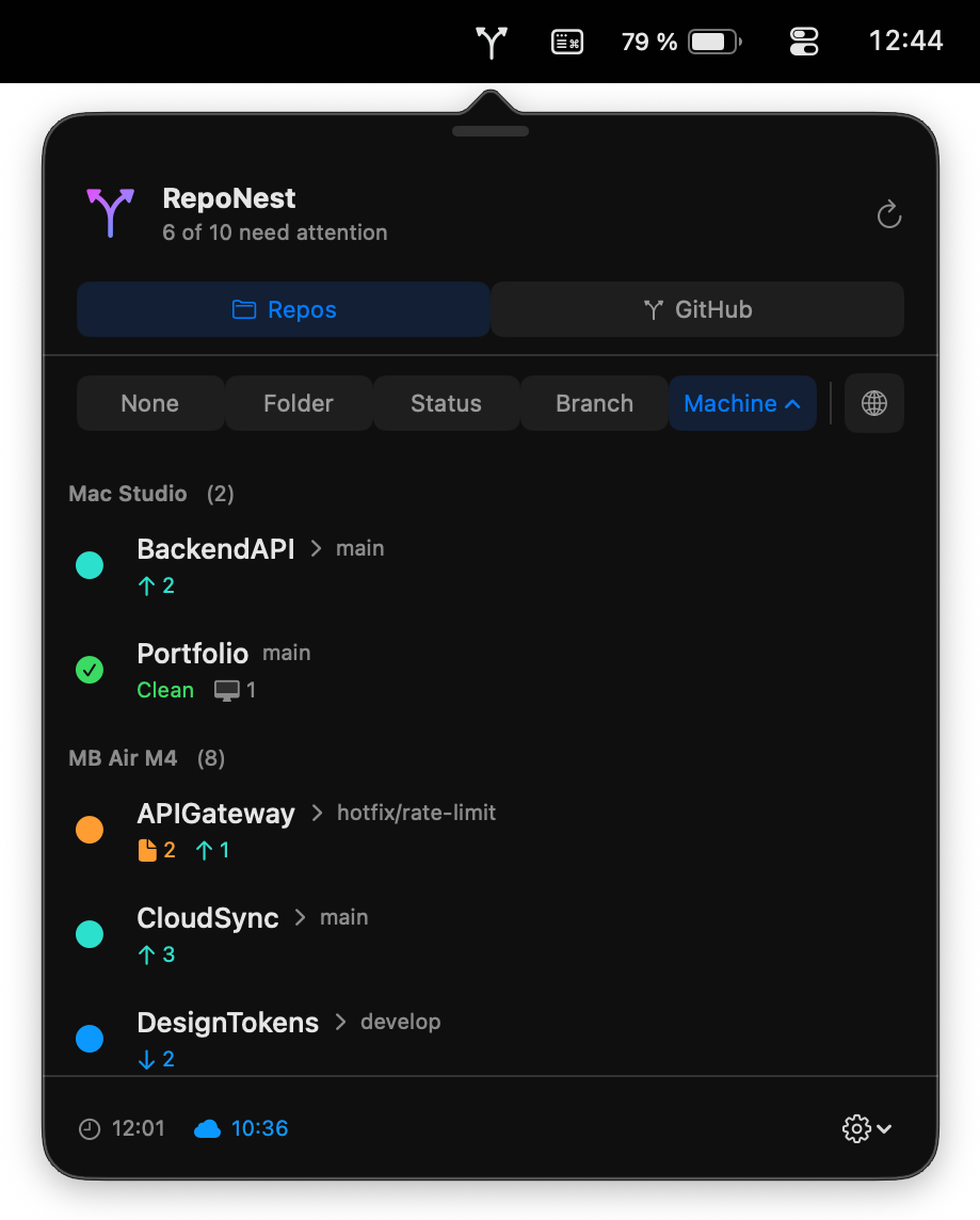If enabled, repo names, branches, and status sync across your Macs via CloudKit. It's your private iCloud container — I can't see it, nobody else can. No code or file contents ever sync.GitHub